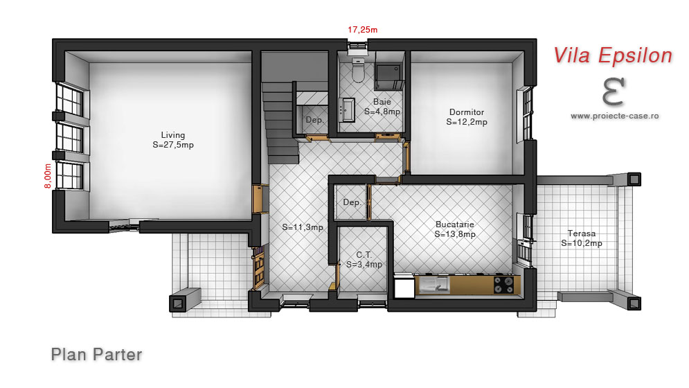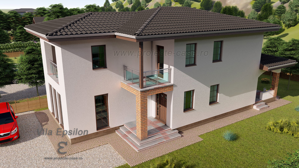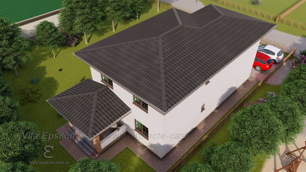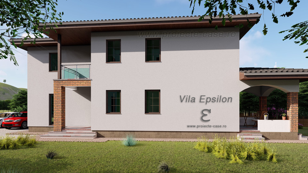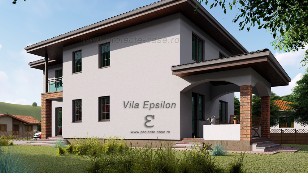 Etajul ne îmbie cu două spaţii deschise, unul mai util decât celălalt: o terasă cu jumătate din suprafaţa celei de la parter şi o logie ataşată celui mai mare dormitor. Aici, cu o ceaşcă de ceai în faţă, te poţi relaxa lecturâd ceva sau pur şi simplu plimbâdu-ţi privirea peste peisaj, în aerul plăcut al serilor calde. Vila Epsilon, un proiect foarte serios alcătuit, nu trebuie să lipsească din opţiuninile tale atunci când îţi cauţi un „cuib”.